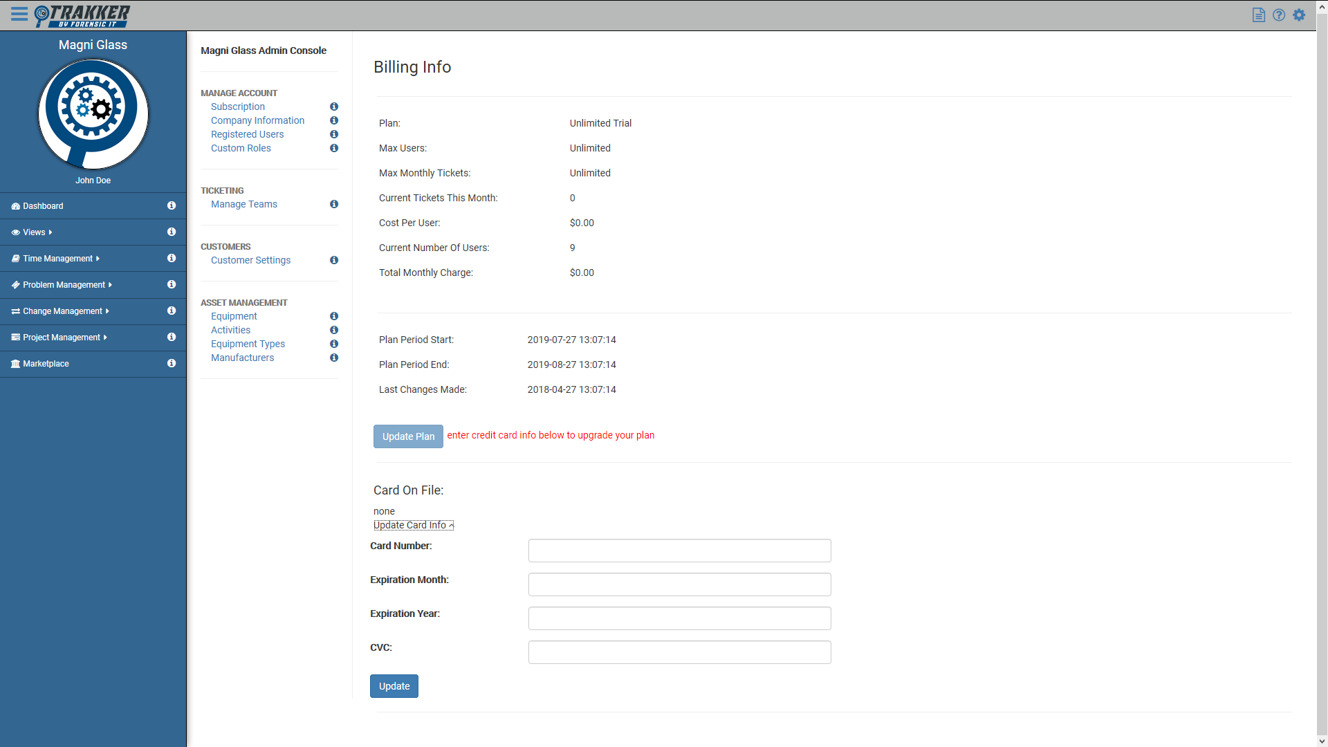 This will display the current subscription plan information, as well as ticket counts, user counts, cost per user, billing dates and total monthly charge amount - To edit your organization's subscription plan, Select the Update Card Info button at the bottom of the page.