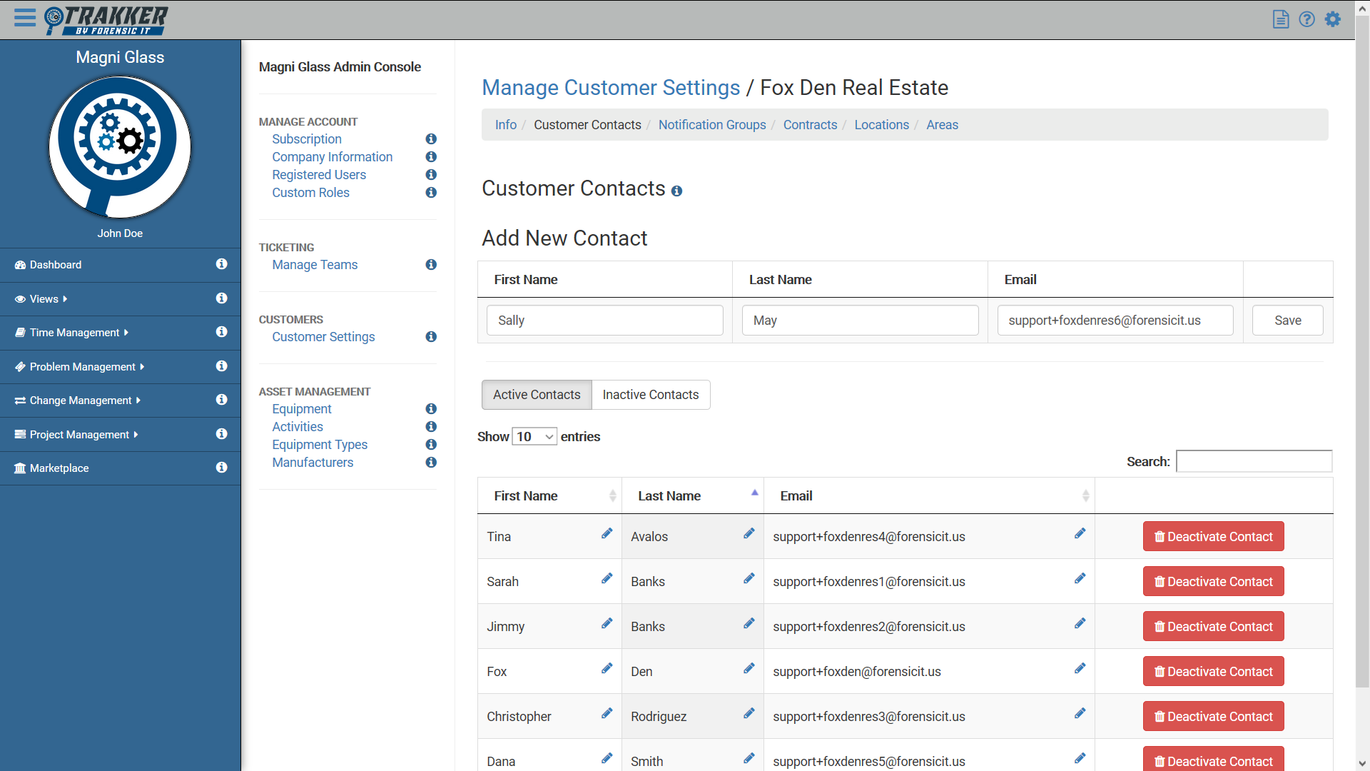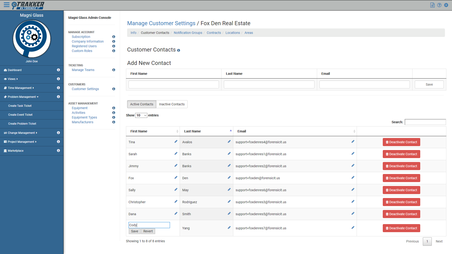 The Customer Contacts page will be displayed, with a table of all active customer contacts for the selected Customer. - Fill out the Add New Contact row with the