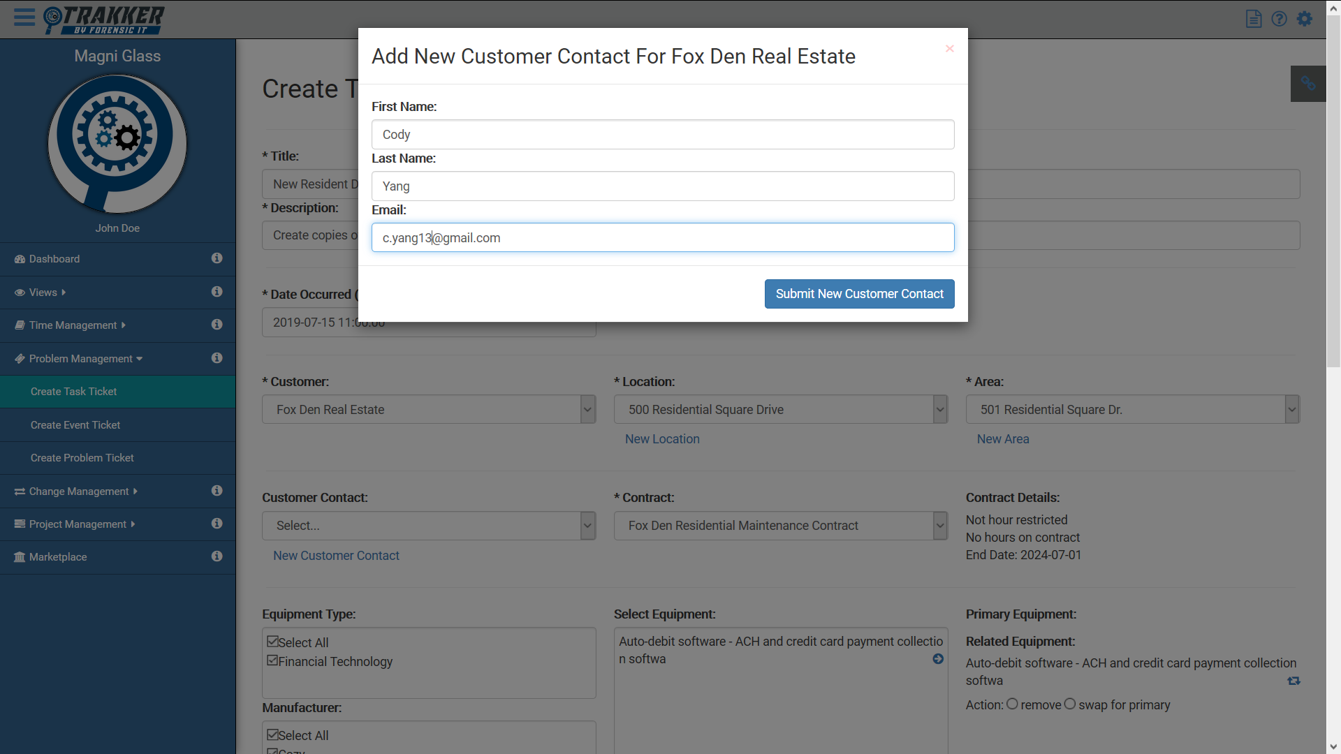 The Add Customer Contact for [Customer Name] modal will appear. - Enter the new customer contact's First Name, Last Name and Email Address in the modal fields and select "Submit New Customer Contact".